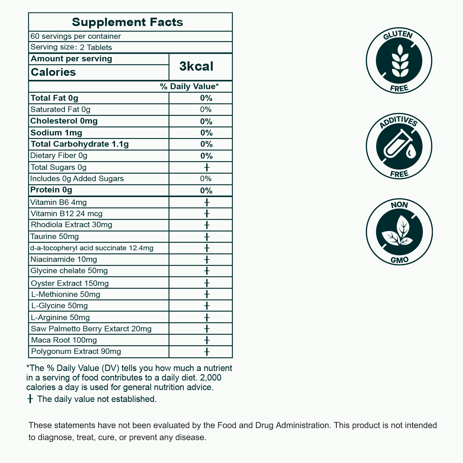 La base de este suplemento de ostras son 150 mg de extracto de ostra de alta calidad, complementado con L-arginina, L-glicina y L-metionina para favorecer la circulación, la recuperación y el metabolismo proteico. El extracto de rodiola contribuye a la resiliencia ante el estrés, mientras que la taurina y la niacinamida actúan junto con las vitaminas B6, B12 y el succinato ácido de d-alfa-tocoferilo (vitamina E) para favorecer una energía limpia y constante, evitando picos de nerviosismo. Una pequeña dosis de extracto de bayas de saw palmetto aporta un refuerzo adicional para el bienestar masculino a largo plazo.