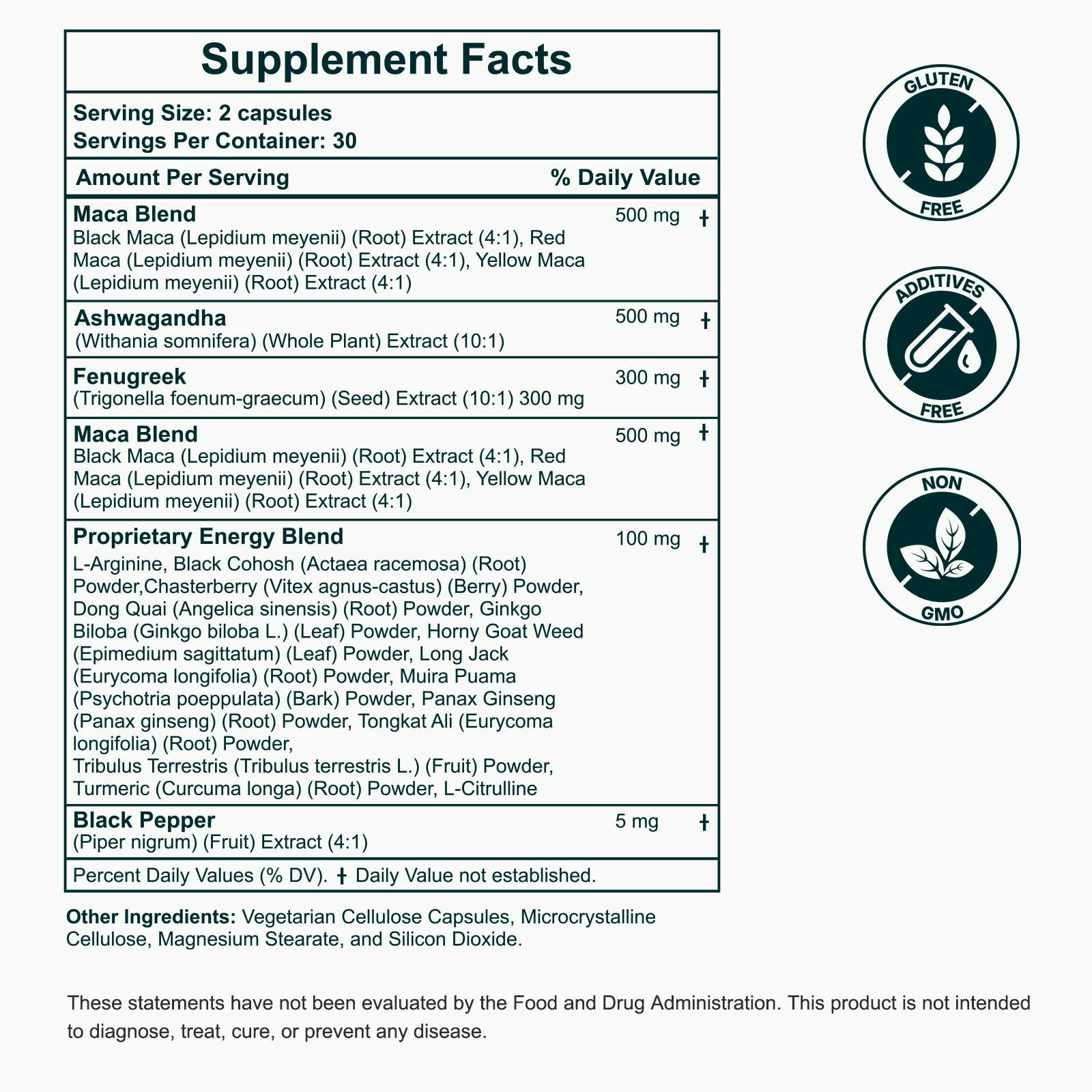 Each serving delivers a concentrated maca blend of black, red, and yellow maca root alongside ashwagandha maca, fenugreek, tongkat ali, horny goat weed, Panax ginseng, L-arginine, L-citrulline, and more in easy-to-take maca root capsules. Together they are designed to support black maca root stamina energy, circulation, and hormone balance so your body is more likely to respond when your mind is actually in the mood.